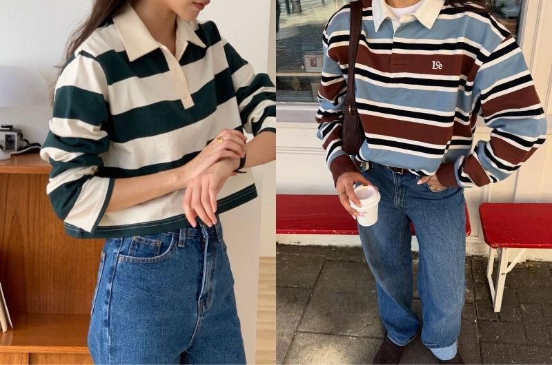 Eccola: la polo da rugby, con righe larghe, colletto bianco e polsini elasticizzati. Simpatica, nostalgica… ma anche molto penalizzante sul fisico femminile.